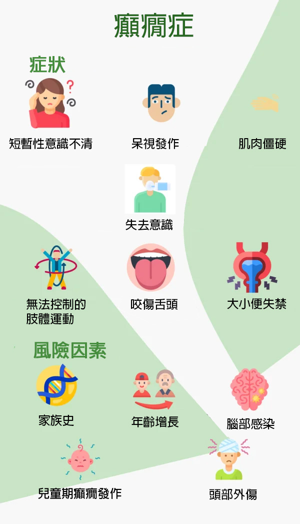 - 癲癇發作的症狀、持續時間和嚴重程度是因應受影響的大腦區域和發作類型而異。